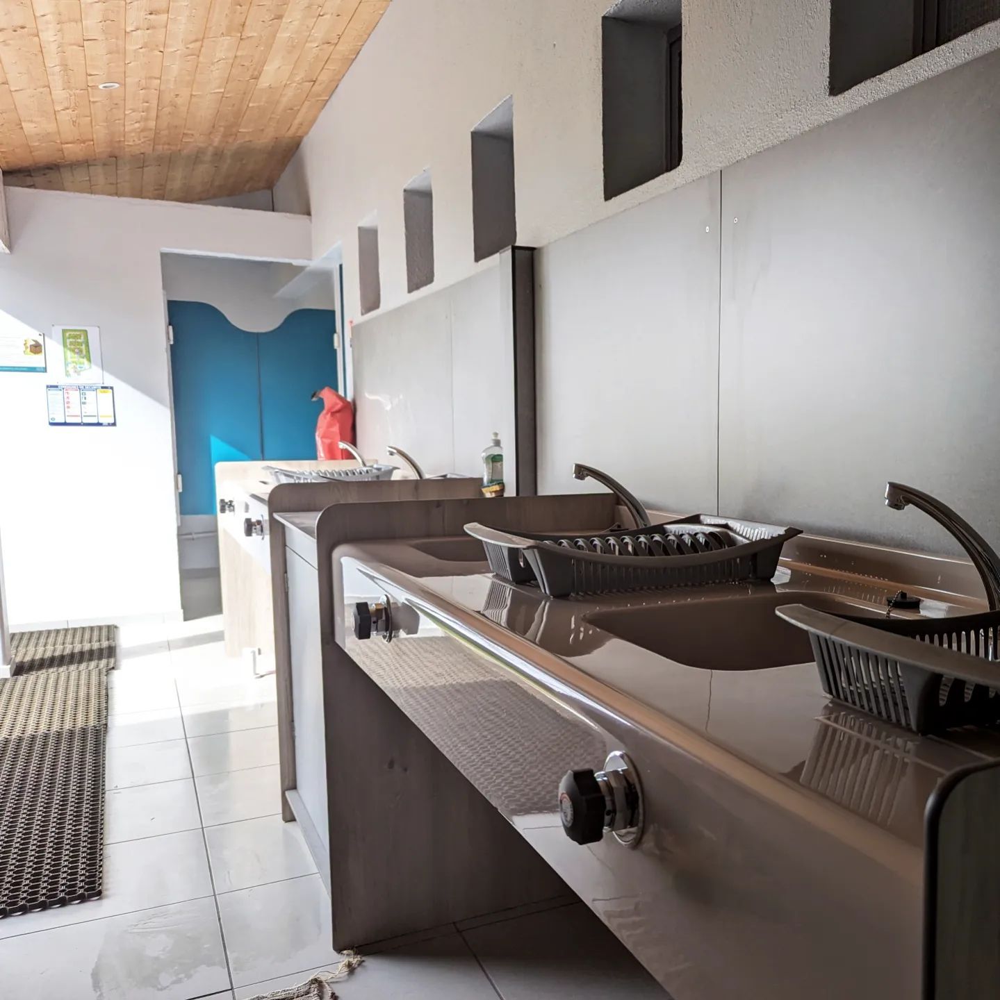 Hay 6 fregaderos a su disposición para lavar los platos y 3 contenedores para lavar la ropa.